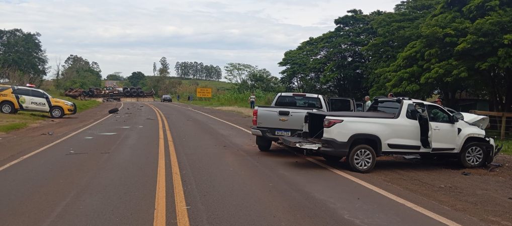 Como consequência, a caminhonete S10 atingiu transversalmente uma Fiat Strada, com placas de Iporã (PR), que seguia logo atrás do caminhão.