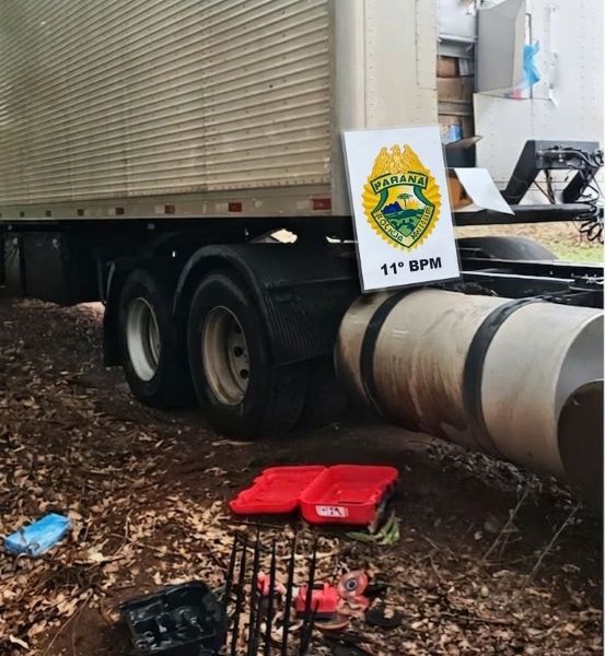 Criminosos armados roubaram carreta e renderam motorista em estrada rural. PM foi recebida a tiros, revidou e prendeu dois suspeitos. Fundo falso escondia equipamentos eletrônicos.